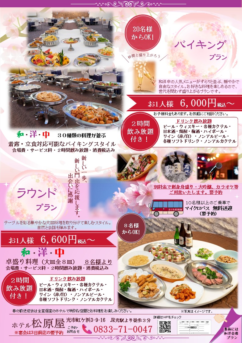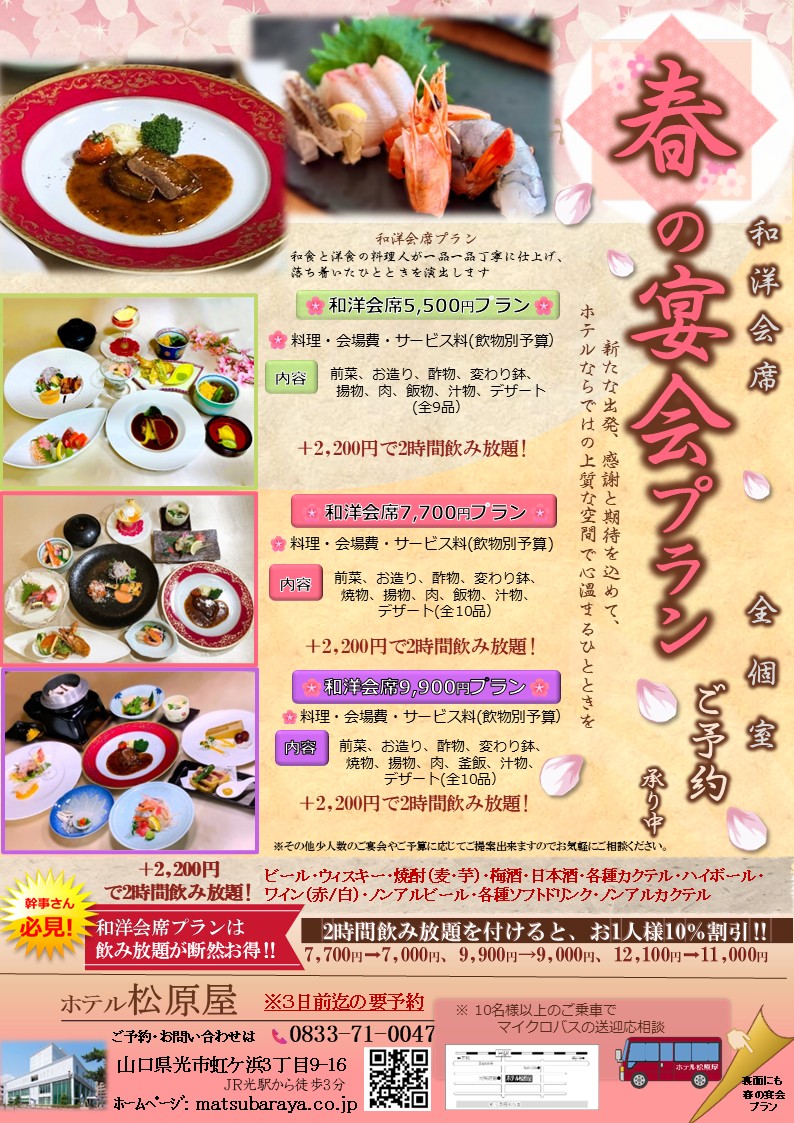 春の宴会プランには別料金で、刺身の舟盛り、大吟醸、カラオケ、思い出を映し出すプロジェクター&スクリーン貸出等々、ご用意できます。(要予約)