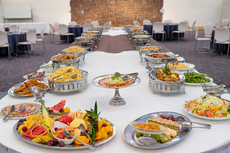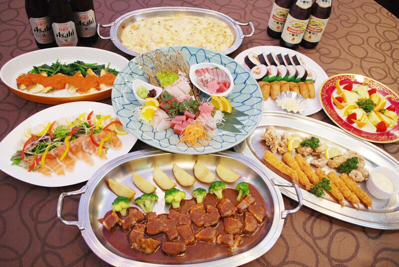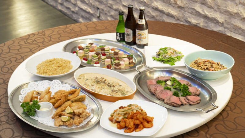 立食、着席どちらも対応可能なバイキングスタイル。和・洋・中の人気メニューがずらりと30種類並ぶ、にぎやかで自由な雰囲気。お好きな料理を楽しめるので、世代を問わず盛り上がるプランです。